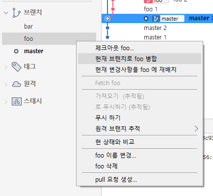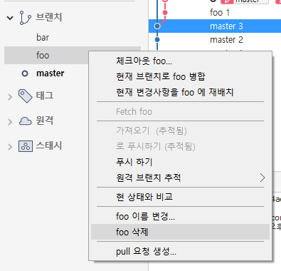 이후 foo 브랜치 위에 마우스를 두고 마우스 오른쪽 버튼을 클릭한다.