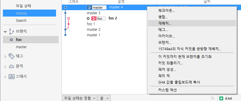 이후 master 브랜치의 4번 커밋으로 브랜치를 재배치할 예정이므로 master의 네 번째 커밋에서 마우스 오른쪽 버튼을 클릭 후 재배치를 클릭한다.