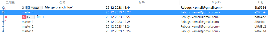 반면, foo 브랜치 입장에서는 커밋이 5개이다.