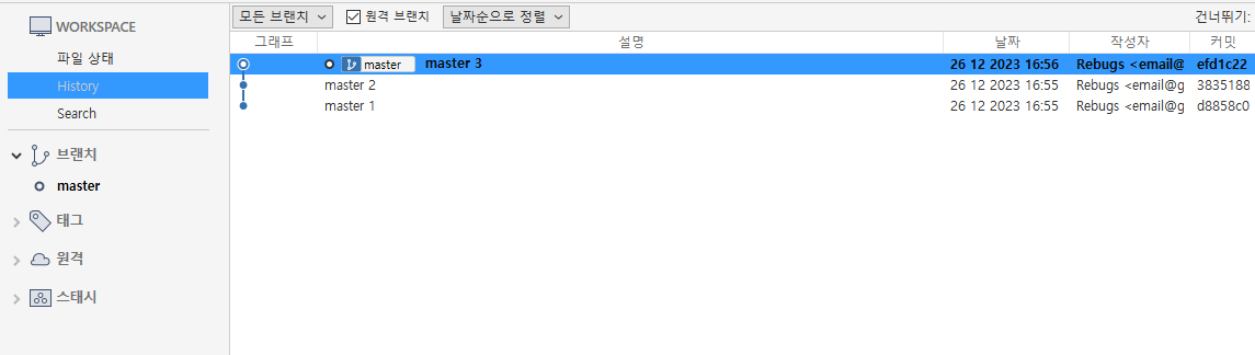 현재 master 브랜치 3번째 커밋 상태이다.