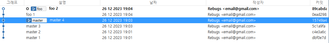 위 그림처럼 bar 브랜치의 4번 커밋을 master 브랜치로 병합하려면 4번 커밋을 클릭한 뒤 확인을 클릭하면 된다.