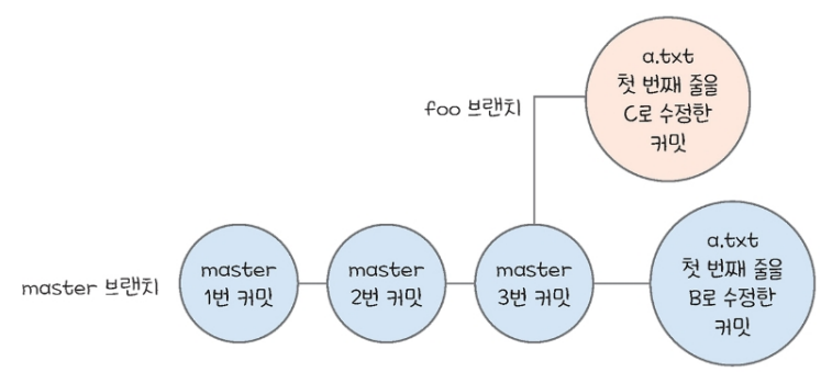 이런 상황에서 foo 브랜치를 master 브랜치에 병합한다면 a.txt 에서 충돌이 발생했다고 한다.
