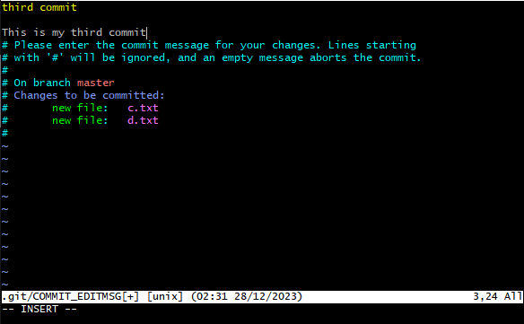 커밋 메시지를 모두 작성하였으면 ESC키를 누르고, ESC를 누르면 아래의 INSERT가 사라졌을 것이다.