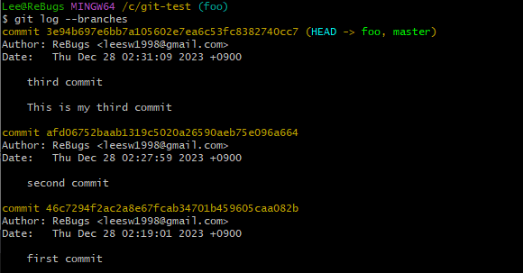 git log는 기본적으로 현재 브랜치를 기준으로 커밋 목록을 조회한다.