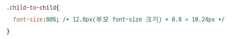 만약 다음과 같이 자식 요소의 font-size 속성값을 80%라고 지정했다면 자식 요소는 부모 요소 font-size 속성값의 80%에 해당하는 크기로 설정된다.