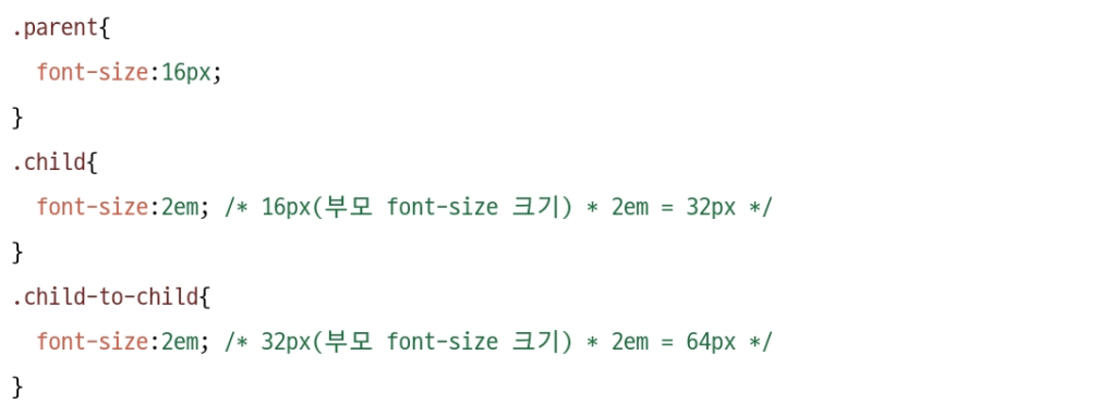 만약 값을 2em으로 지정했다면 자식 요소의 크기는 부모 요소의 font-size 속성값의 2배가 된다.