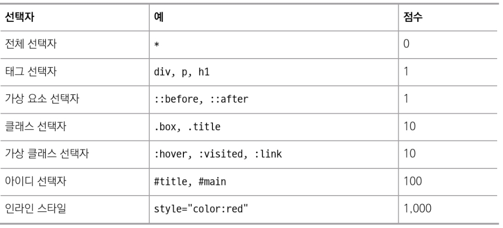 개별성 규칙 점수사용된 선택자 종류를 파악해 점수를 계산하는 방식인데, 아래 그림처럼 선택자를 분류해서 개수를 세고 점수를 곱해 합을 구하면 된다. 추가적으로 !important라는 특별한 문법이 있다. 이 문법의 점수는 10,000점이다.
