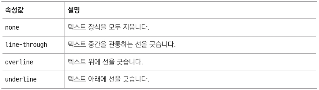 a 태그를 이용하여 링크를 걸면 기본으로 텍스트 아래에 선이 그어지는 이유가 이 속성의 값이 underline이 되어 있기 때문이다.