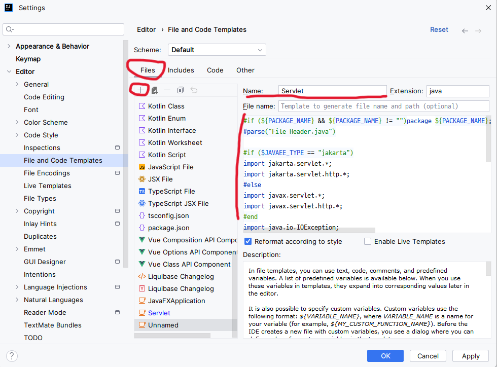 Editor - File and Code Templates - Other 탭에서