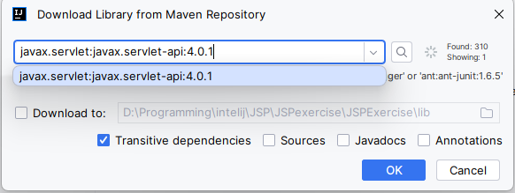 javax.servlet:javax.servlet-api:4.0.1 를 검색한다(오른쪽 검색버튼을 누르고 기다리면 됌)