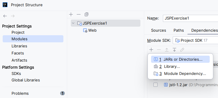 이후 JARs or Dircetories.. 버튼을 눌러서 아까 다운로드 받은 JAR 파일을 추가해준다.