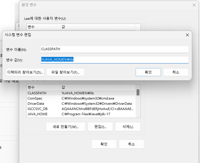 - 변수 이름은 CLASSPATH, 변수 값은 %JAVA_HOME%\lib 로 설정한다.