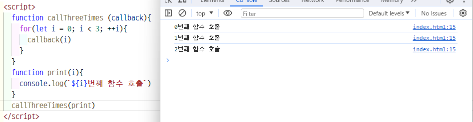 callThreeTimes() 내부의 for문에서 callThreeTimes()의 매개변수로 들어온 함수가 호출된다.