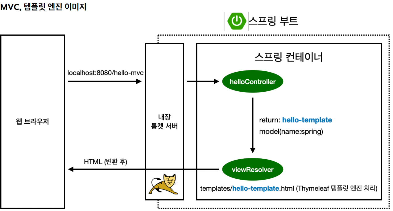 viewResolver가 동작한다. viewResolver는 view를 찾아주고, 템플릿 엔진을 연결시켜주는 역할을 한다. viewResolver가 templates/hello-template.html 을 찾아서 Thymeleaf 템플릿 엔진에게 처리 요청을 한다.