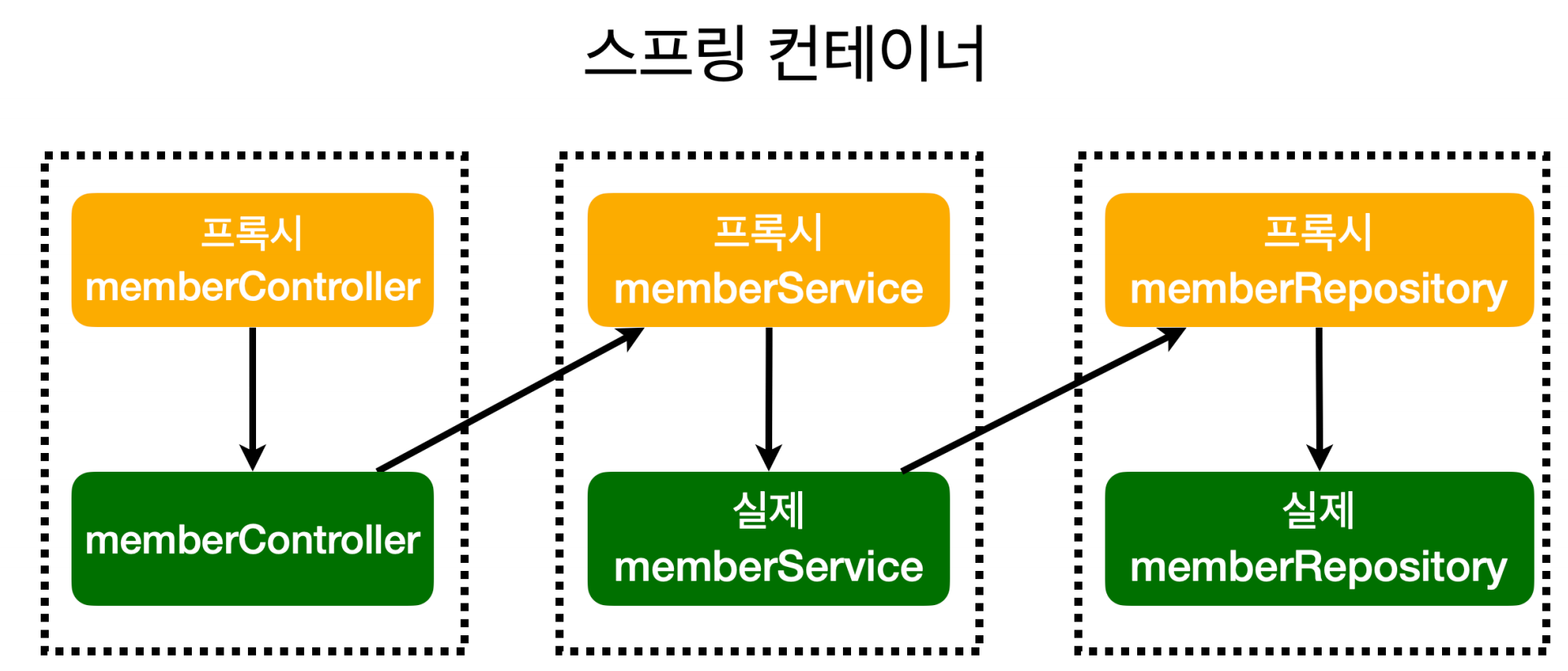 실제 스프링 빈들 앞에 proxy 빈을 만들어주고 스프링 컨테이너는 의존성 주입때 proxy빈을 넣어준다.