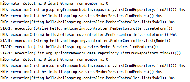 여기서는 모든 메서드에 적용하도록 hello.hellospring 의 모든 하위 패키지를 적용시킨 것이다.