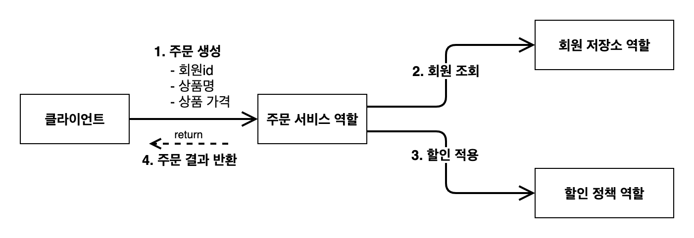 회원을 메모리에서 조회하고, 정액 할인 정책(고정 금액)을 지원해도 주문 서비스를 변경하지 않아도 된다. 역할들의 협력 관계를 그대로 재사용 할 수 있다.