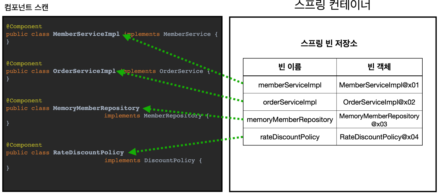 - @ComponentScan 은 @Component 가 붙은 모든 클래스를 스프링 빈으로 등록한다.