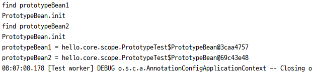 프로토타입 빈을 2번 조회했으므로 완전히 다른 스프링 빈이 생성되고, 초기화도 2번 실행된 것을 확인할 수 있다.
