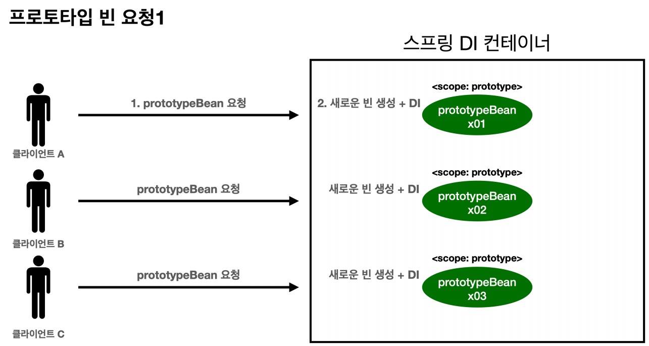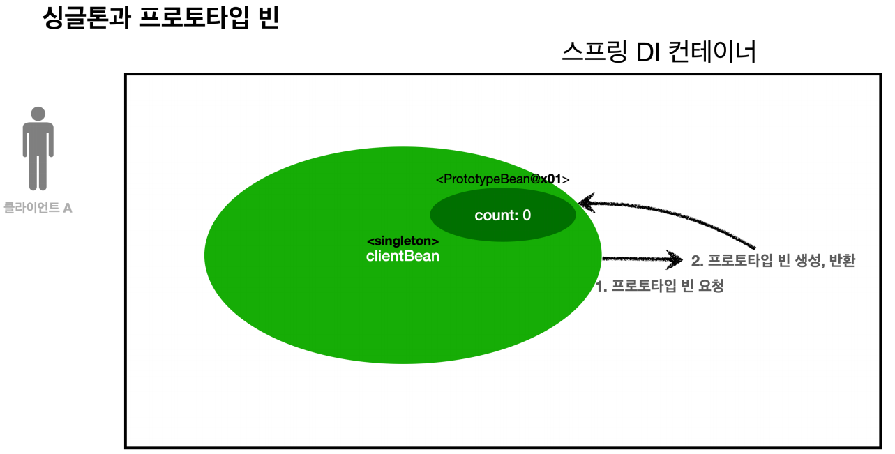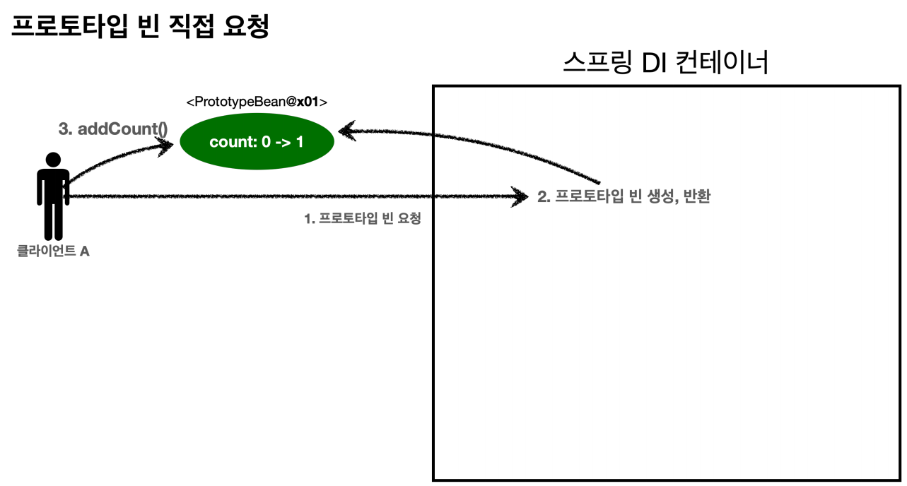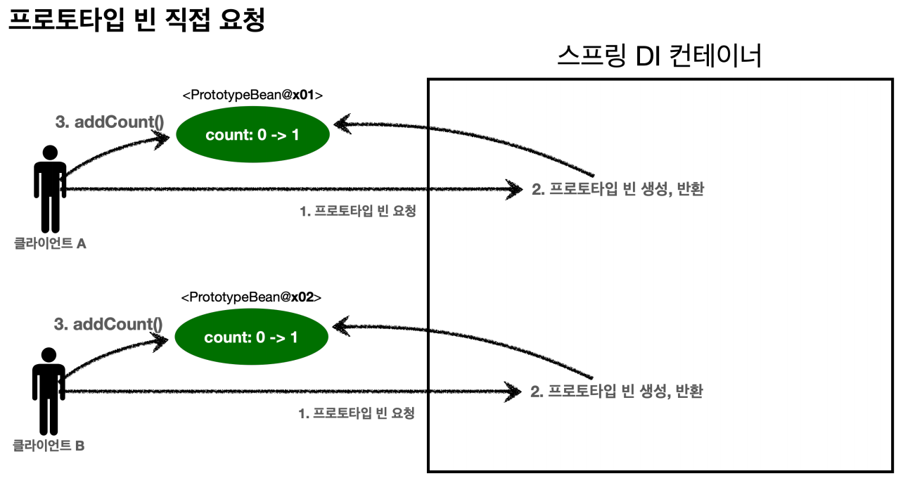 1. 클라이언트A는 스프링 컨테이너에 프로토타입 빈을 요청한다. 2. 스프링 컨테이너는 프로토타입 빈을 새로 생성해서 반환(x01)한다. 해당 빈의 count 필드 값은 0이다. 3. 클라이언트는 조회한 프로토타입 빈에 addCount() 를 호출하면서 count 필드를 +1 한다.