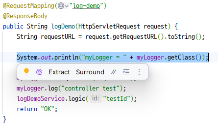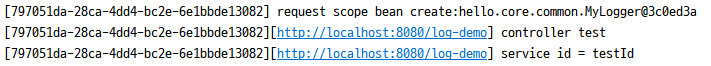 [d06b992f...] request scope bean create [d06b992f...][http://localhost:8080/log-demo] controller test [d06b992f...][http://localhost:8080/log-demo] service id = testId [d06b992f...] request scope bean close