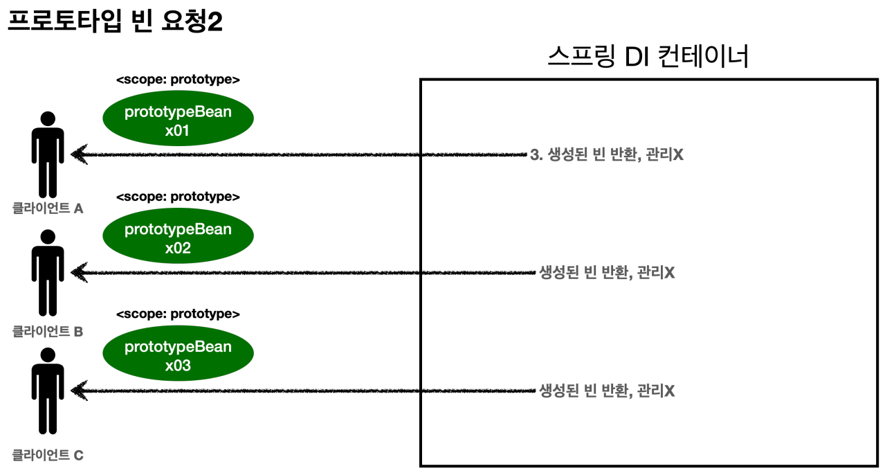 3. 스프링 컨테이너는 생성한 프로토타입 빈을 클라이언트에 반환한다. 4. 이후에 스프링 컨테이너에 같은 요청이 오면 항상 새로운 프로토타입 빈을 생성해서 반환한다.