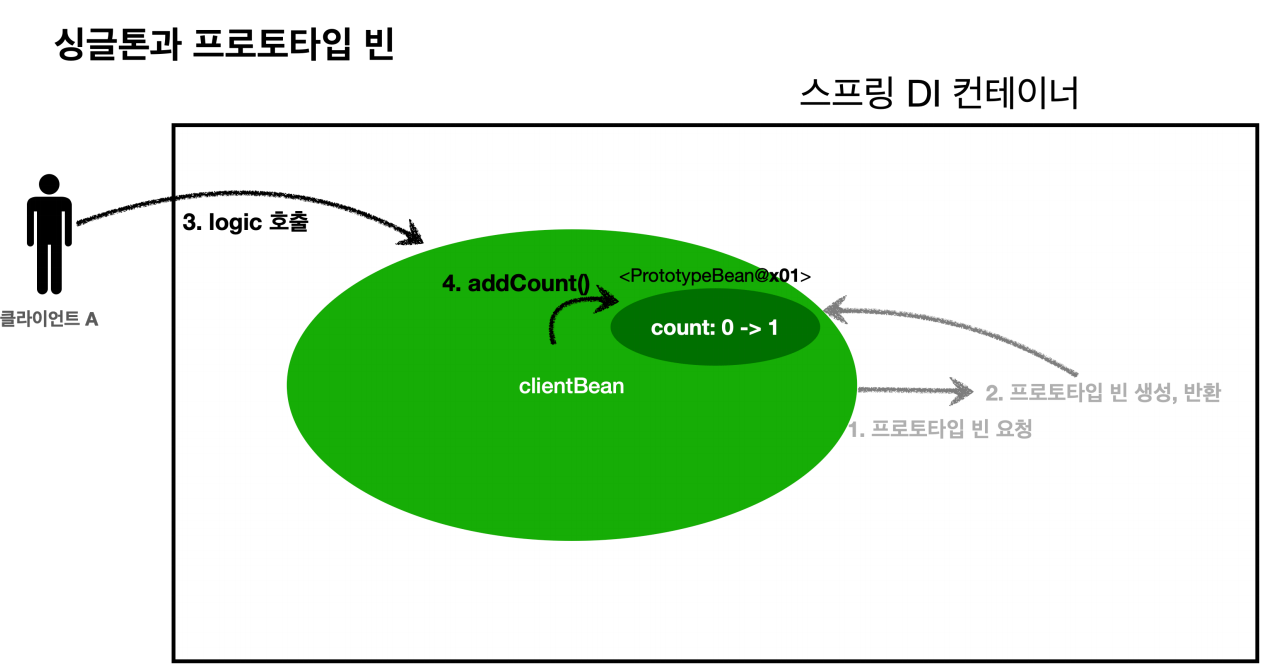 3. 클라이언트 A는 clientBean.logic() 을 호출한다. 4. clientBean 은 prototypeBean의 addCount() 를 호출해서 프로토타입 빈의 count를 증가한다.
