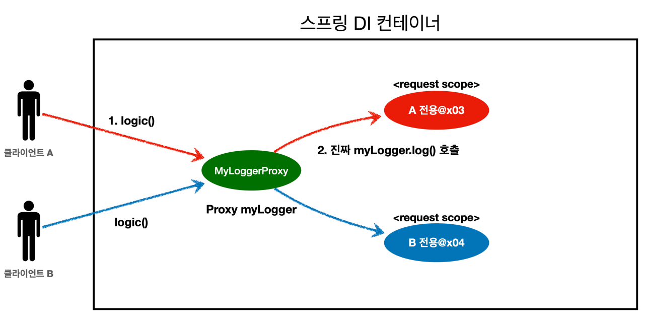 또한, A와 B가 동시에 요청을 하였더라도 각각 클라이언트에 다른 스프링 빈이 할당된다.