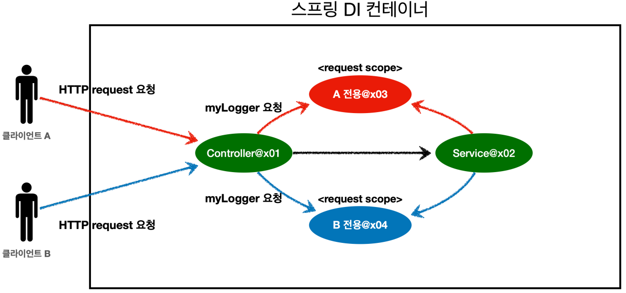- request scope를 사용하지 않고 파라미터로 이 모든 정보를 서비스 계층에 넘긴다면, 파라미터가 많아서 지저분해진다. 더 문제는 requestURL 같은 웹과 관련된 정보가 웹과 관련없는 서비스 계층까지 넘어가게 된다.