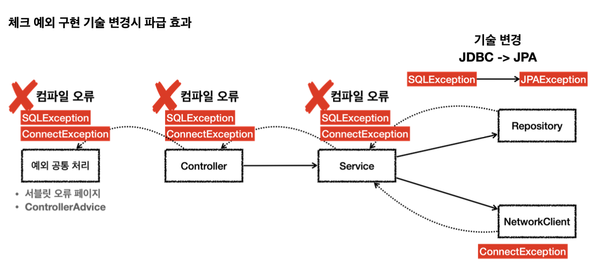 시스템 레벨에서 발생한 예외는 복구 불가능한 예외이다. 그런데 체크 예외이기 때문에 컨트롤러나 서비스 입장에서는 본인이 처리할 수 없어도 어쩔 수 없이 throws를 통해 던지는 예외를 선언해야 한다.