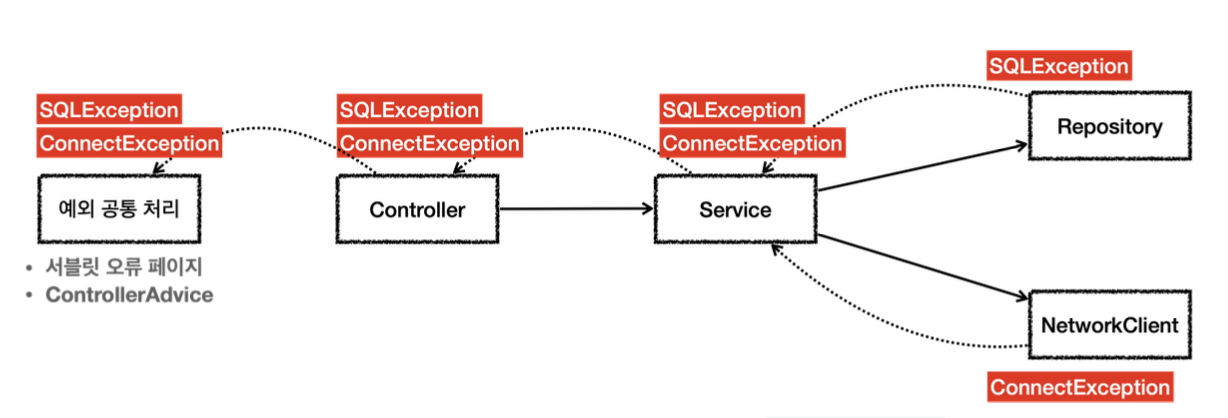 - 서비스는 리포지토리와 NetworkClient를 둘다 호출한다. 따라서 두 곳에서 올라오는 체크 예외인 SQLException과 ConnectException을 처리해야 한다.