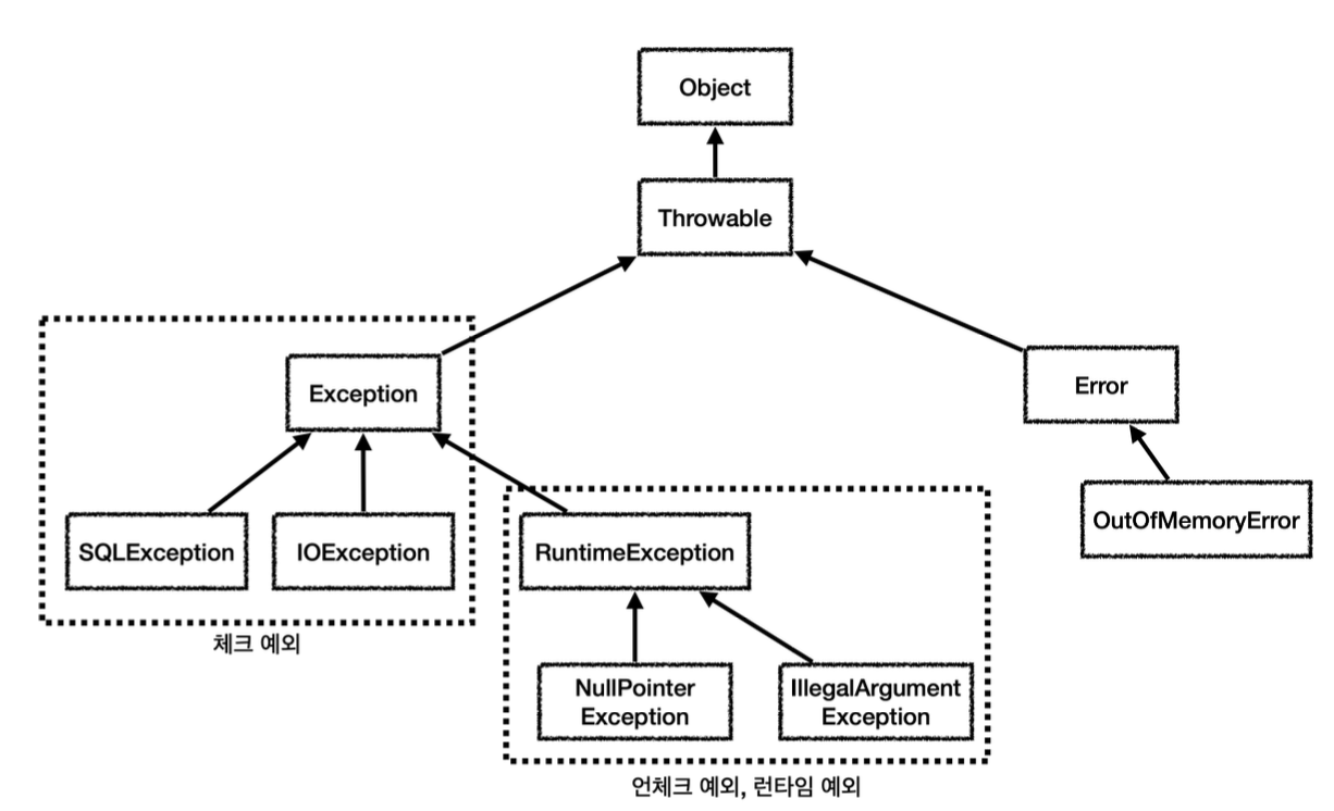 - Object : 예외도 객체이다. 모든 객체의 최상위 부모는 Object이므로 예외의 최상위 부모도 Object이다.
