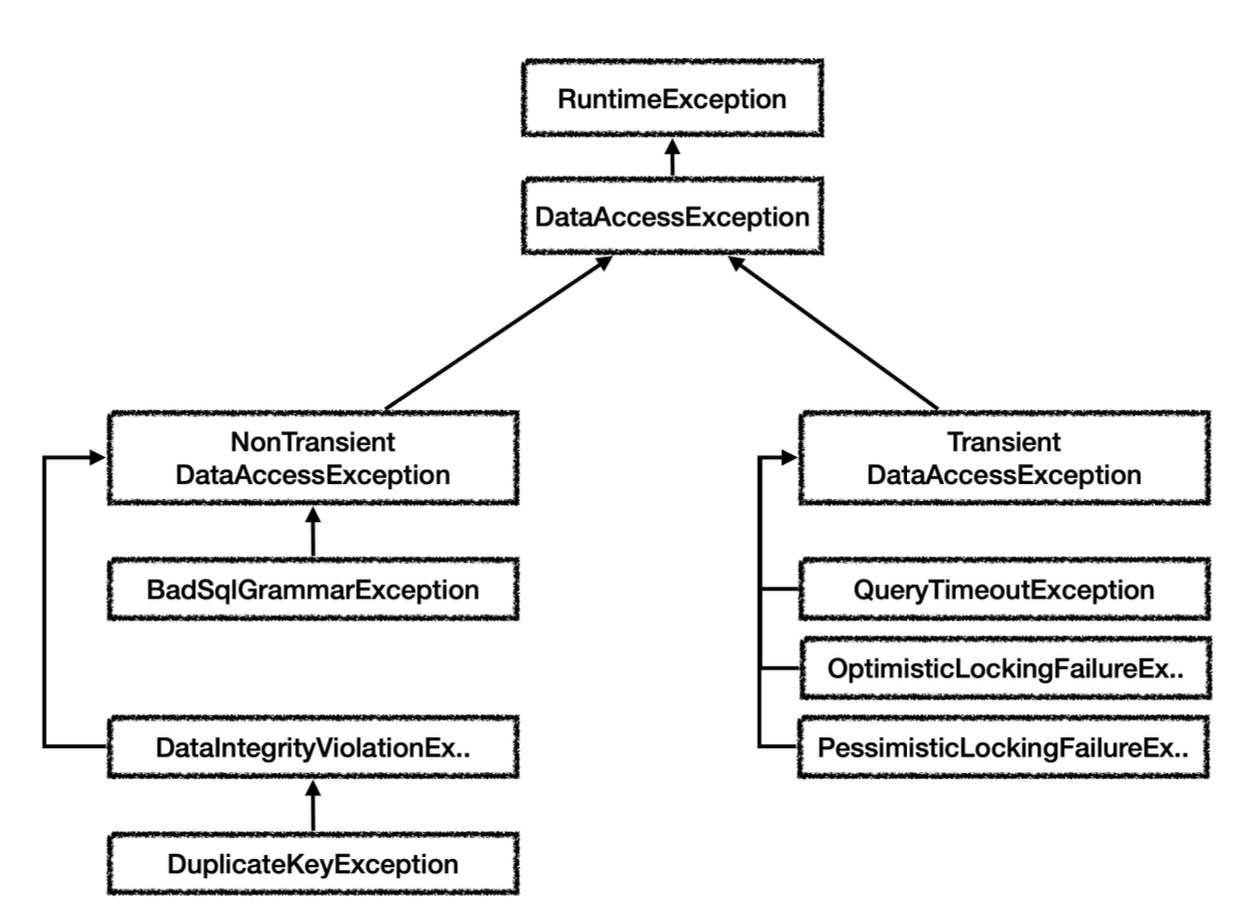 참고로 BadSqlGrammarException 은 최상위 타입인 DataAccessException 를 상속 받아서 만들어진다.