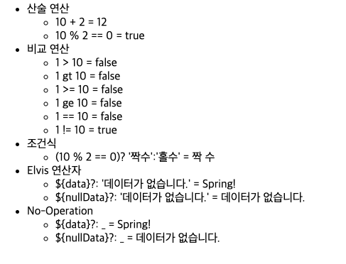 | 간단한 표현 ◦ 변수 표현식: ${...} ◦ 선택 변수 표현식: *{...} ◦ 메시지 표현식: #{...} ◦ 링크 URL 표현식: @{...} ◦ 조각 표현식: ~{...} 리터럴 ◦ 텍스트: 'one text', 'Another one!',... ◦ 숫자: 0, 34, 3.0, 12.3,... ◦ 불린: true, false ◦ 널: null ◦ 리터럴 토큰: one, sometext, main,... 문자연산 ◦ 문자 합치기: + ◦ 리터럴 대체: |The name is ${name}| 산술연산 ◦ Binary operators: +, -, *, /, % ◦ Minus sign (unary operator): - 불린연산 ◦ Binary operators: and, or ◦ Boolean negation (unary operator): !, not 비교와 동등 ◦ 비교:>,<,>=,<=(gt,lt,ge,le) ◦ 동등 연산: ==, != (eq, ne) 조건연산 ◦ If-then: (if) ? (then) ◦ If-then-else: (if) ? (then) : (else) ◦ Default: (value) ?: (defaultvalue) 특별한 토큰: ◦ No-Operation: _ |