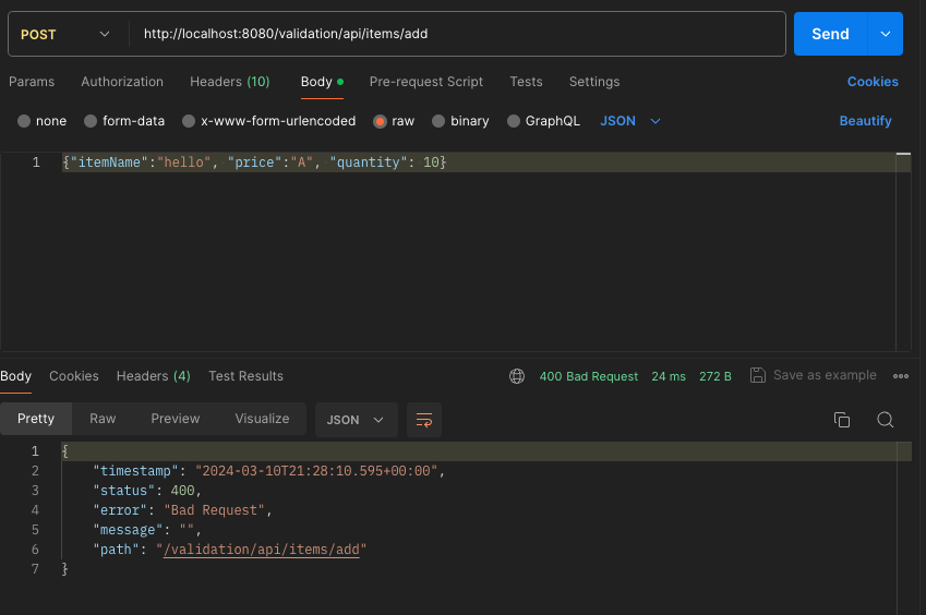 - 검증 오류 요청: JSON을 객체로 생성하는 것은 성공했고, 검증에서 실패함
