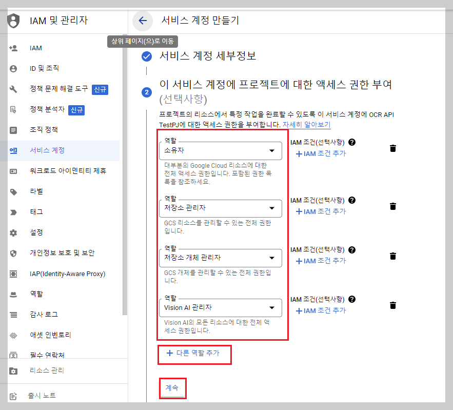IAM 및 관리자 - 서비스 계정 버튼 클릭