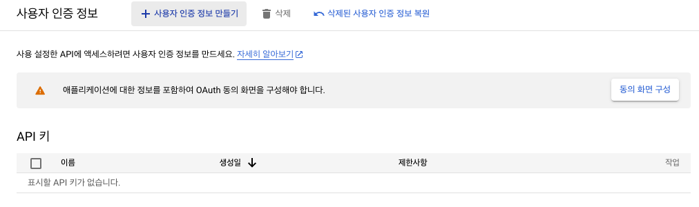 구글 클라우드 의 콘솔 창으로 들어가면 왼쪽 상단의 버튼을 눌러 API 및 서비스 - 사용자 인증 정보로 들어간다.