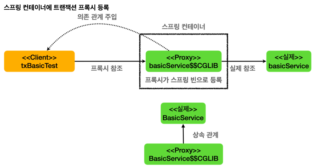 클라이언트인 txBasicTest 는 스프링 컨테이너에 @Autowired BasicService basicService 로 의존관계 주입을 요청한다.