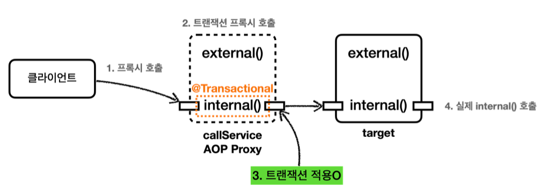 @Transactional 을 메서드나 클래스에 붙이면 해당 객체는 트랜잭션 AOP 적용의 대상이 되고, 결과적으로 실제 객체 대신에 트랜잭션을 처리해주는 프록시 객체가 스프링 빈에 등록된다. 그리고 주입을 받을 때도 실제 객 체 대신에 프록시 객체가 주입된다.
