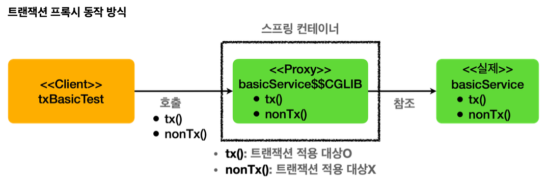 @Transactional 애노테이션이 특정 클래스나 메서드에 하나라도 있으면 트랜잭션 AOP는 프록시를 만들어서 스프링 컨테이너에 등록한다. 그리고 실제 basicService 객체 대신에 프록시인 basicService$ $CGLIB 를 스프링 빈에 등록한다.