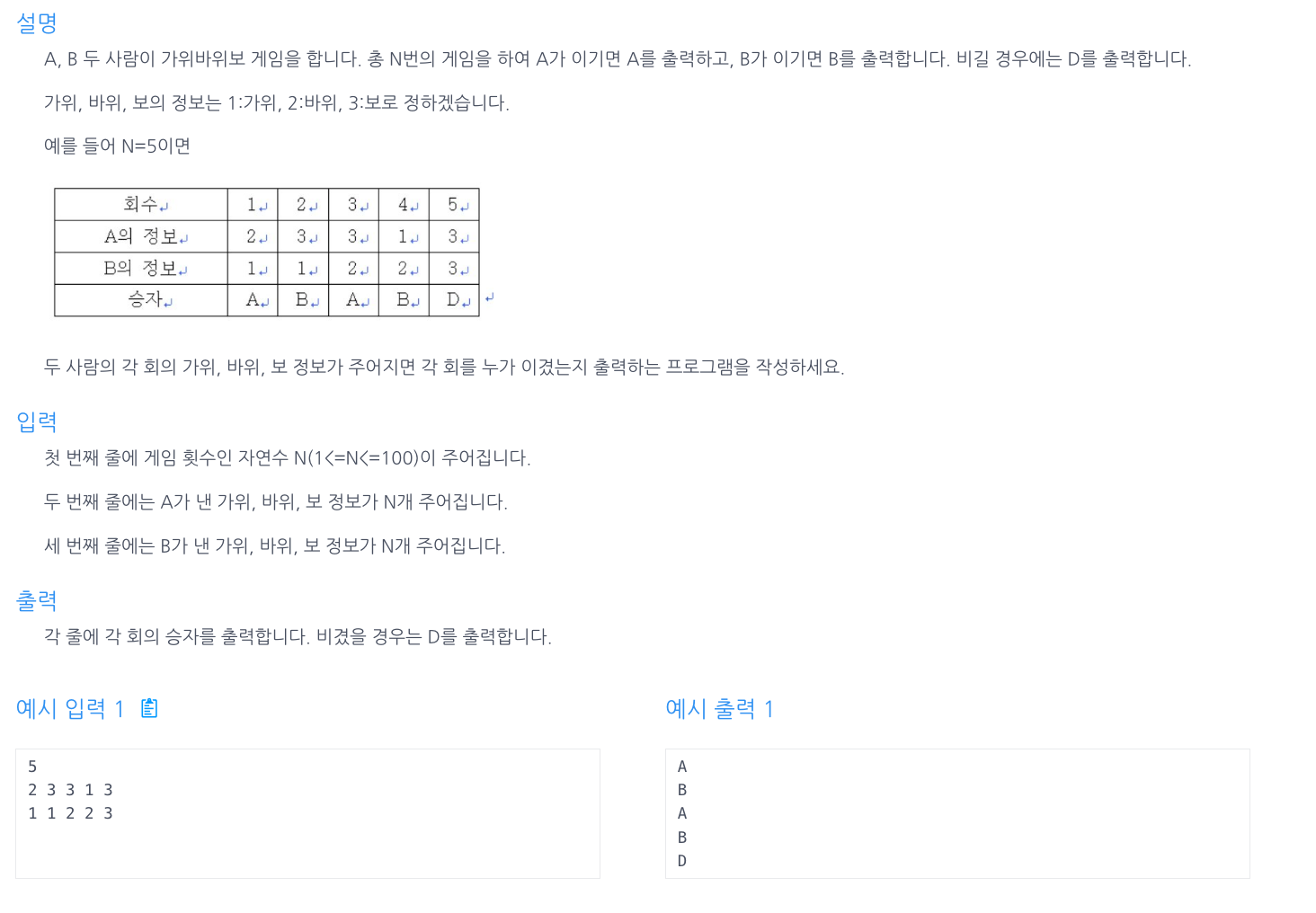 - 두 플레이어의 선택이 같으면 “D”를 출력하여 무승부임을 나타낸다.