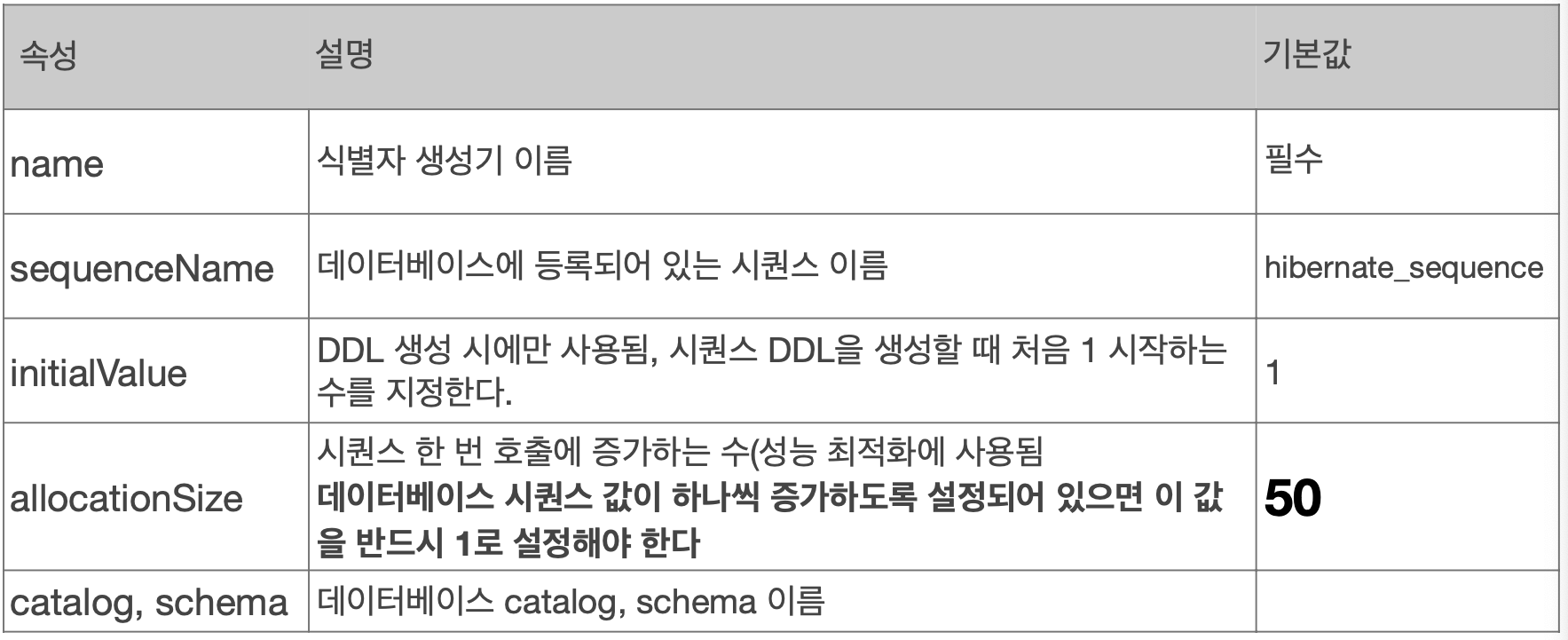 - allocationSize: 시퀀스 값의 증가 크기이다.