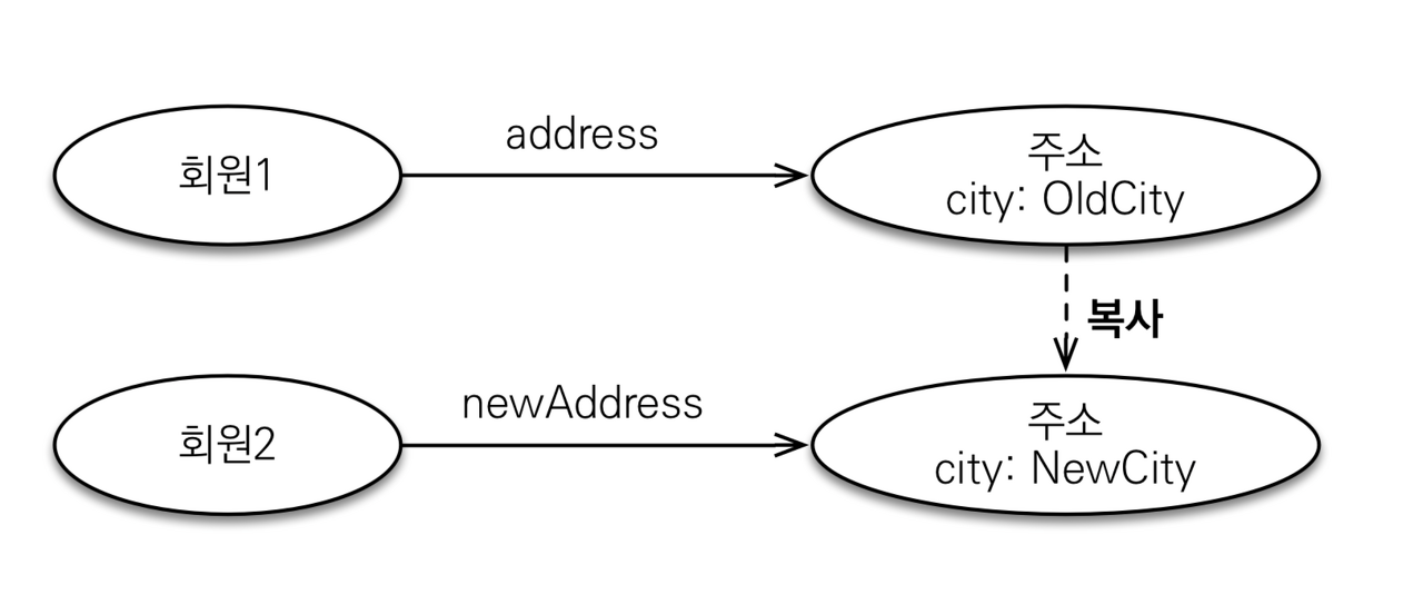 그래서 값 타입의 실제 인스턴스인 값을 공유하는 방식 대신, 값(인스턴스)를 복사해서 사용한다.