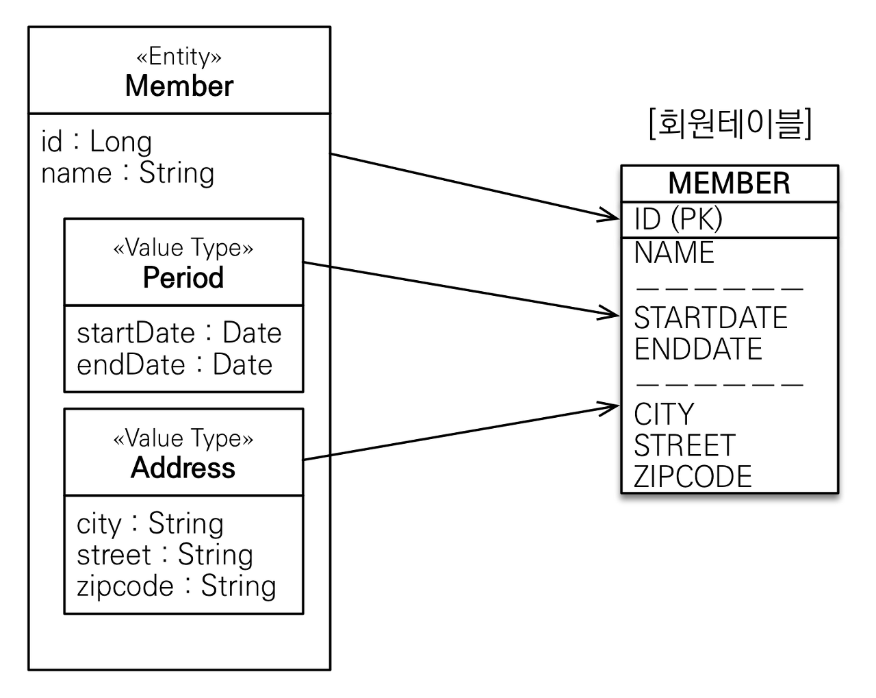 임베디드 타입은 엔티티의 값일 뿐이고, 임베디드 타입을 사용하기 전과 후에 매핑하는 테이블은 같다. 객체와 테이블을 아주 세밀하게(find-grained) 매핑하는 것이 가능하다.