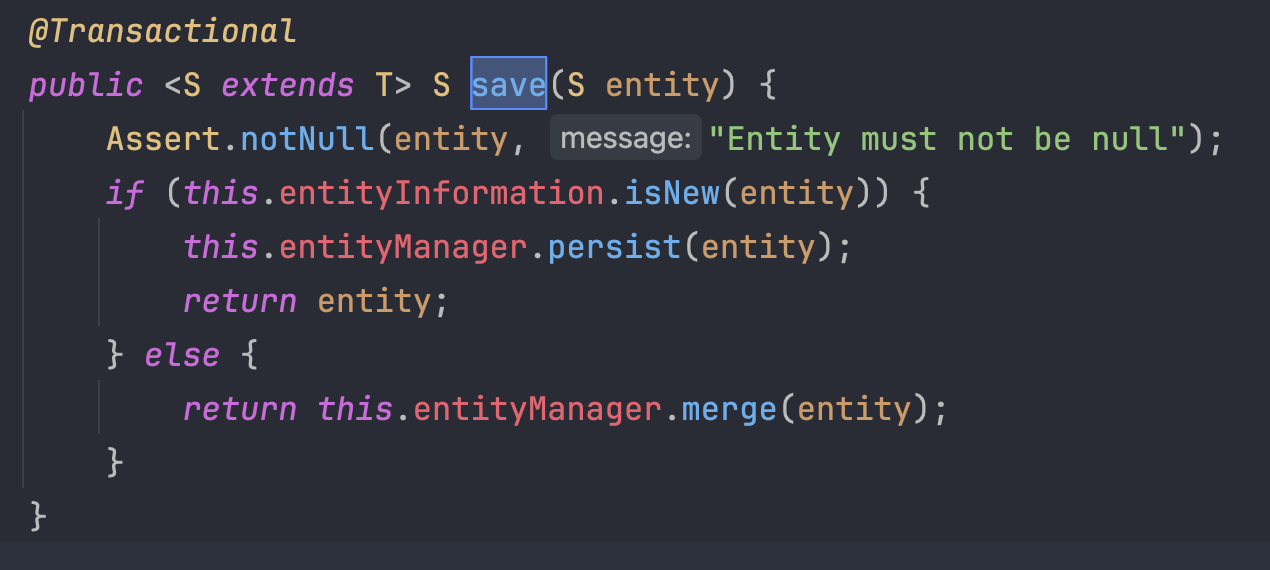 따라서 영속성 컨텍스트는 데이터베이스에서 데이터를 조회하게 되고, DB에 데이터가 없다는 것을 뒤 늦게 알고 그제서야 새로운 객체로 판단하게 된다.