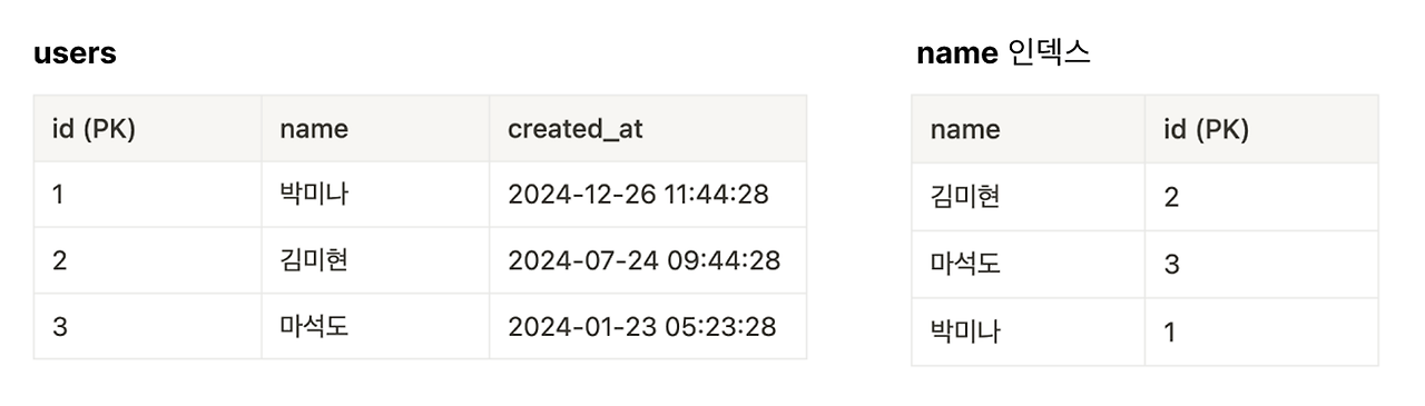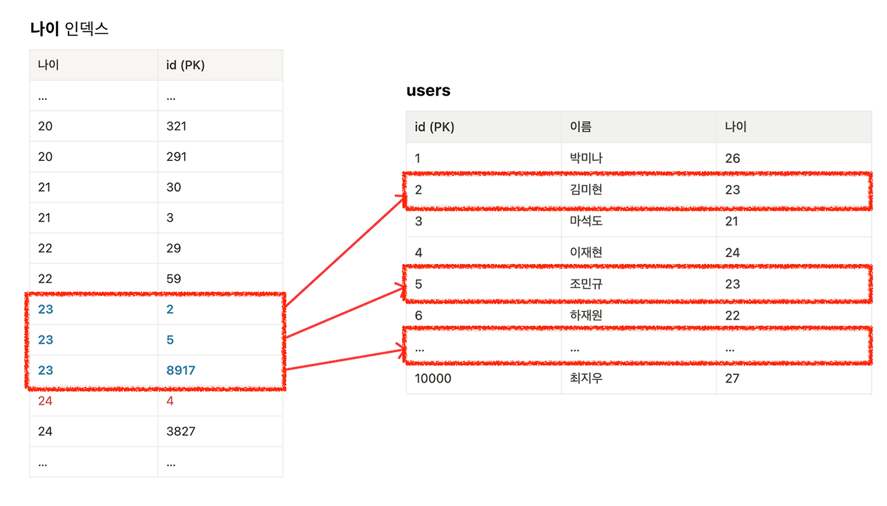 나이를 기준으로 정렬해놓은 표를 가지고 있기 때문에, 나이를 기준으로 데이터를 조회할 때 훨씬 빠르게 찾을 수 있었던 것이다.