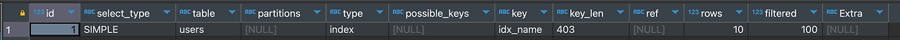 type이 index인걸로 봐서 풀 인덱스 스캔을 한것을 확인할 수 있다. 즉, 인덱스를 처음부터 끝까지 다 읽어서 필요한 데이터를 뽑아냈다.