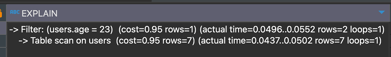 ->0.0502 (뒤에 있는 숫자) : 마지막 데이터까지 접근한 시간 - Filter: (users.age = 23) : 필터링을 통해 데이터를 추출했다. (필터링을 할 때의 조건은 users.age = 23)