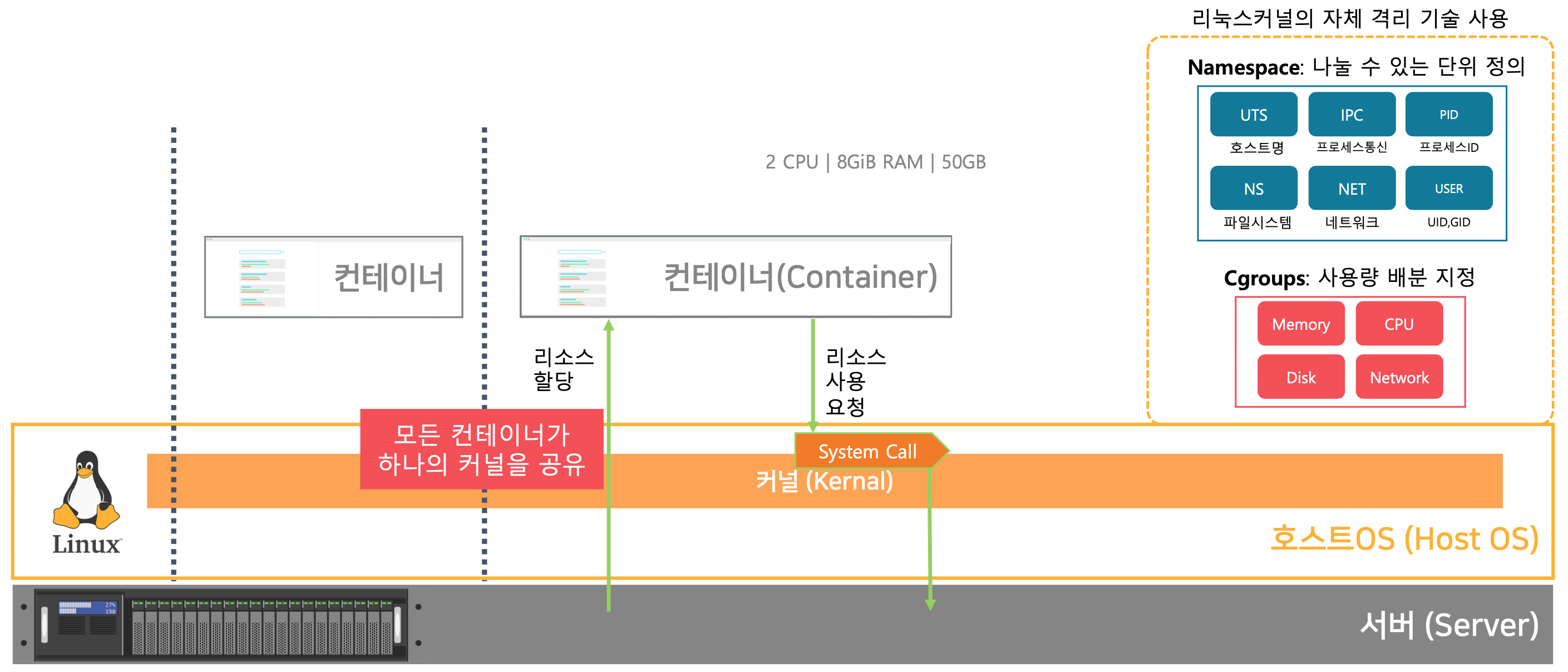 - 그러나 네임스페이스(Namespaces)와 cgroups(Control Groups) 기술을 통해 프로세스, 네트워크, 파일 시스템, 메모리, CPU 등 자원들을 서로 격리할 수 있다.
