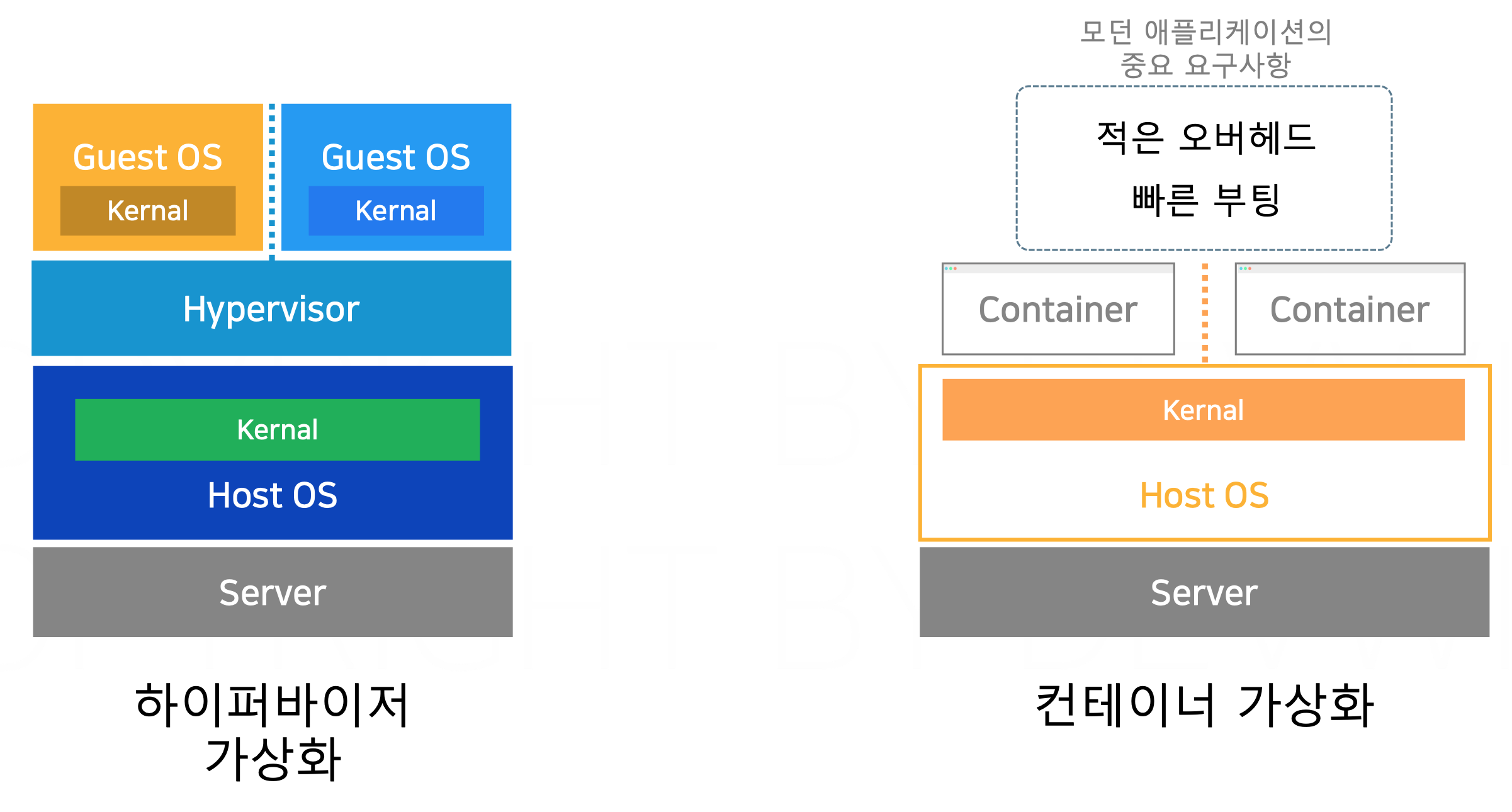 -하이퍼바이저는 물리적 서버 자원을 관리하며, 각 가상 머신이 요청하는 자원을 분배한다. - 컨테이너 가상화: